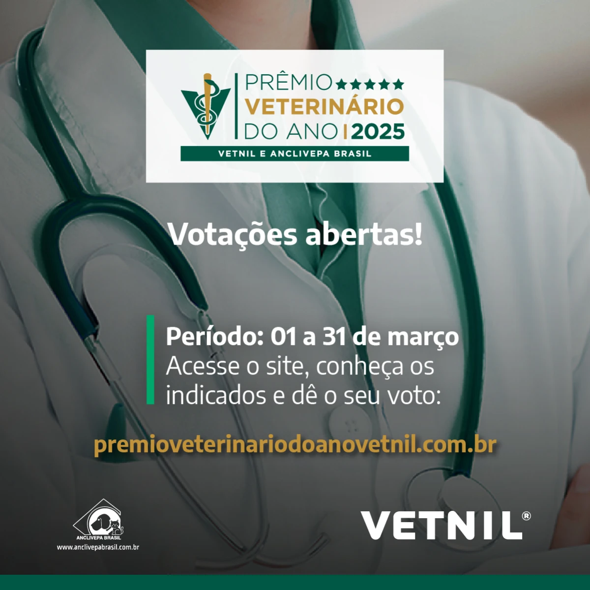 As votações para o Prêmio Veterinário do Ano Vetnil® Anclivepa Brasil 2025 já estão abertas e acontecem ao longo do mês de março de 2026. Em sua 14ª edição, o prêmio reconhece e homenageia Médicos-Veterinários atuantes na clínica de pequenos animais que mais se destacaram ao longo do ano, segundo a avaliação da própria classe veterinária. Para conhecer os indicados e realizar o voto, basta acessar o site www.veterinariodoanovetnil.com.br, sendo permitido 1 voto por número de CRMV ativo, conforme regulamento disponível na plataforma.