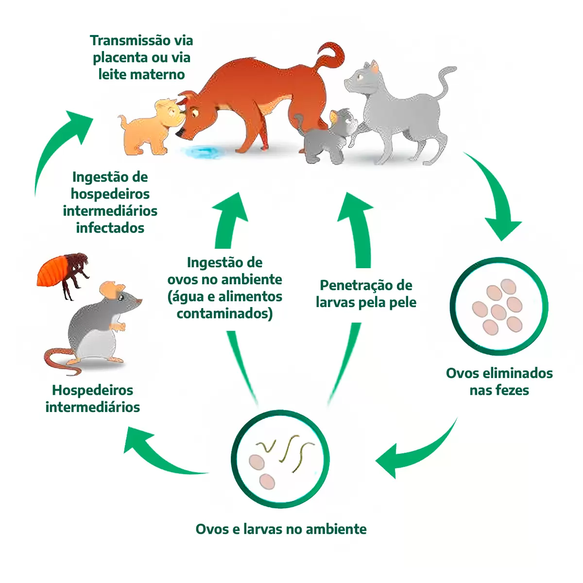 Os animais correm o risco de entrar em contato com esses parasitas por diversas vias, seja pelo ambiente, por meio da ingestão de água e/ou alimento contaminado, pelo contato com hospedeiros intermediários (como pulgas) ou até mesmo pelas fezes de outros animais infectados. Filhotes também podem se contaminar por meio da ingestão do leite materno ou ainda durante a gestação.