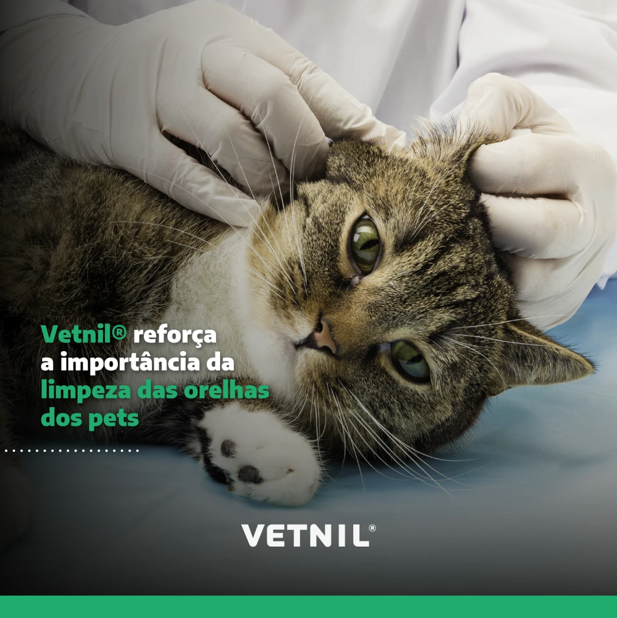 Para garantir uma limpeza segura e adequada das orelhas dos pets, é importante se atentar a alguns cuidados, como a frequência, que deverá ser avaliada pelo veterinário, e não utilizar hastes flexíveis de uso humano ou outros objetos que possam ferir a região. Além disso, é fundamental optar pelo uso de produtos otológicos específicos para pets, como Aurivet® Clean pH Neutro, lançamento da Vetnil®, que conta com uma composição que confere alto poder de remoção do excesso de cerúmen, sem irritar o conduto auditivo.