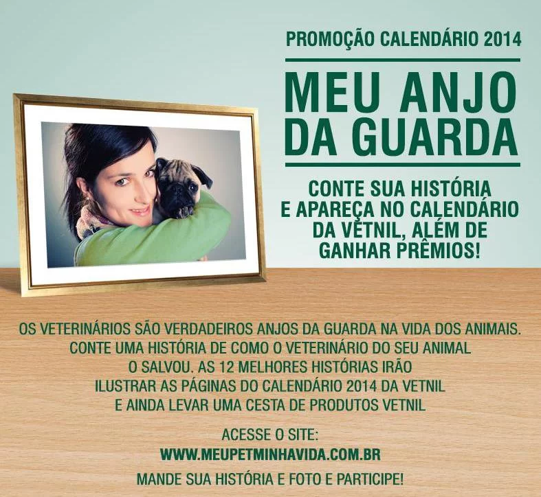 Como participar: basta enviar a história – com no máximo 40 palavras – e a foto colorida com tamanho mínimo de 1 mega através do site www.meupetminhavida.com.br ou para o e-mail calendario2014@meupetminhavida.com.br com o assunto “Promoção Anjos da Guarda, minha história” e os dados – nome completo, telefone e e-mail.