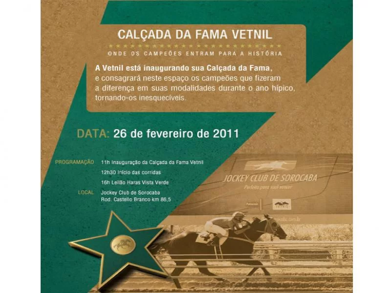 A Vetnil inaugurará sua Calçada da Fama e consagrará, neste espaço, os campeões que fizeram a diferença em suas modalidades durante o ano hípico, tornando-os inesquecíveis.
