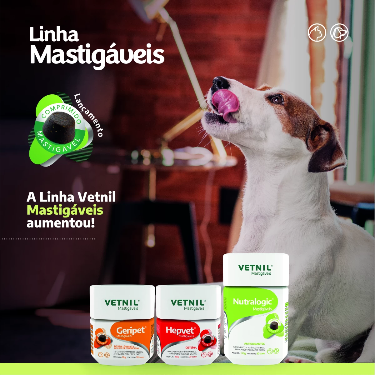 Além do Nutralogic® Mastigáveis, já fazem parte da linha os suplementos Geripet® Mastigáveis e Hepvet® Mastigáveis.