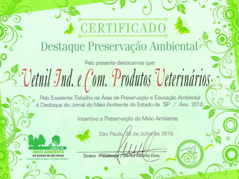 No último dia 20 de julho, a Vetnil Indústria e Comércio de Produtos Veterinários foi condecorada com o certificado Destaque de Preservação Ambiental 2010, recebendo o Selo Verde por demonstrar responsabilidade socioambiental do Jornal do Meio Ambiente do Estado de São Paulo.