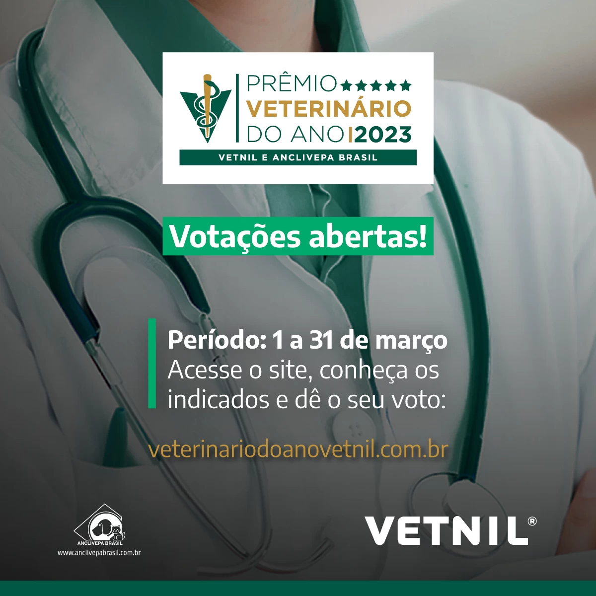 Votações abertas: Prêmio Veterinário do Ano Vetnil Anclivepa Brasil 2023.