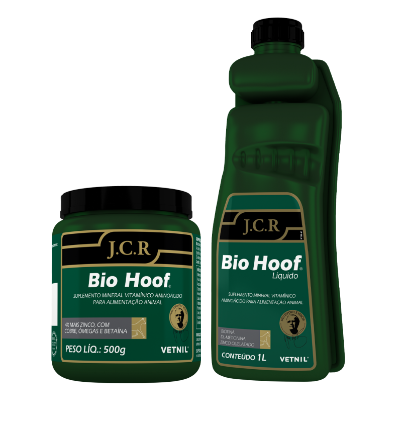 Bio Hoof® JCR is a vitamin, mineral and amino acid supplement for equines, mules and donkeys, which contains elements that help the growth and maintenance of the integrity of the hooves, skin, hair, tail and mane of the animals.