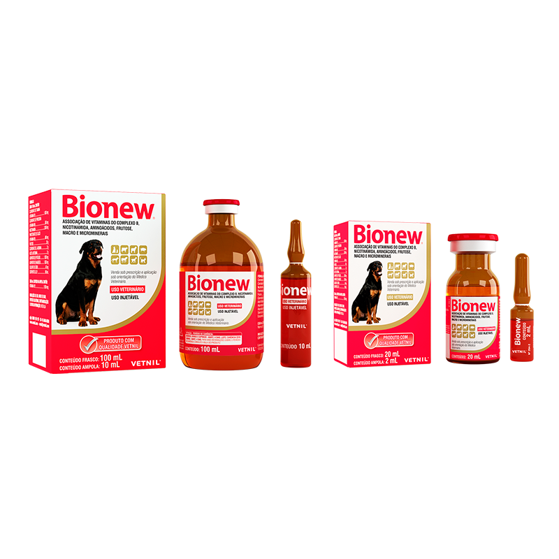 Bionew® es un complejo de vitaminas B, butafosfano y aminoácidos. Es indicado para perros y gatos en el tratamiento de carencias de los ingredientes que componen la formula del producto.