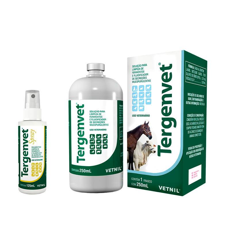 Tergenvet® tiene como propiedad principal la capacidad de reducir la tensión superficial o interfacial de un medio con relación al otro y facilitar el mestizaje entre ellos. Por esta razón, fluidifica las secreciones espesas y remove a medio líquido las adherencias y tejidos necrosados, lo que favorece su eliminación. Debido a su capacidad tensoactiva, favorece la penetración de otros compuestos en los tejidos, esto ayuda en la antisepsia y, consecuentemente, la mejora del cuadro clínico.