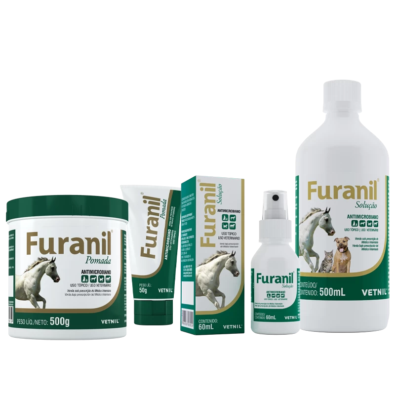 Furanil® solução e Furanil® pomada Indicado para equinos na profilaxia e tratamento das infecções bacterianas e fúngicas da pele e mucosas, órgãos genitais, piodermites, foliculites, pododermatites e micoses. Também está indicado para a assepsia de feridas, cortes, escoriações, abscessos, fístulas e ulcerações de decúbito.