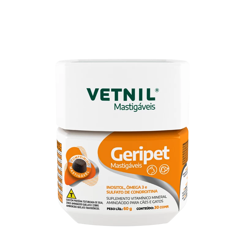 O Geripet® Mastigáveis é um suplemento formulado especialmente para suprir as principais demandas nutricionais de cães e gatos na maturidade e idosos, já que animais em idade avançada necessitam de nutrientes específicos para uma melhor qualidade de vida. Possui componentes que estão relacionadas a propriedades antioxidantes, a ajuda na remoção dos radicais livres e à manutenção da saúde das células. Possui, ainda, Colina e Inositol, além de outras vitaminas, Ômega 3 e Glutamina. A apresentação em comprimidos mastigáveis auxilia a aceitação pelo animal, tornando sua administração mais um momento de diversão entre o tutor e o pet.