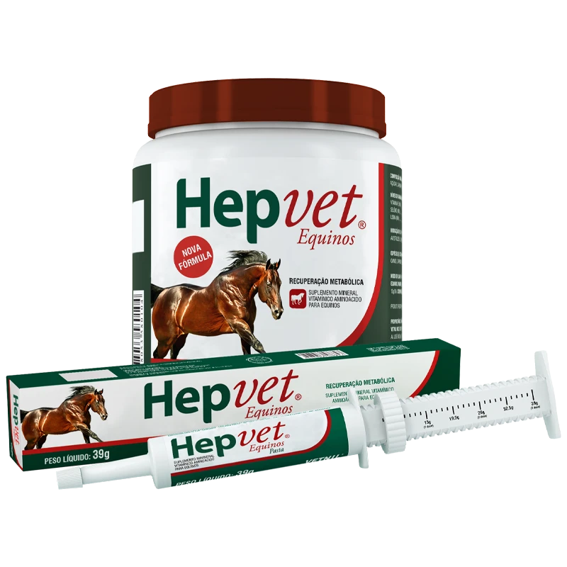 Hepvet® Equinos contém elementos importantes para auxiliar na recuperação física de animais submetidos a condições extremas de exercício e estresse metabólico. Disponível em pó ou pasta, facilitando a administração do produto.