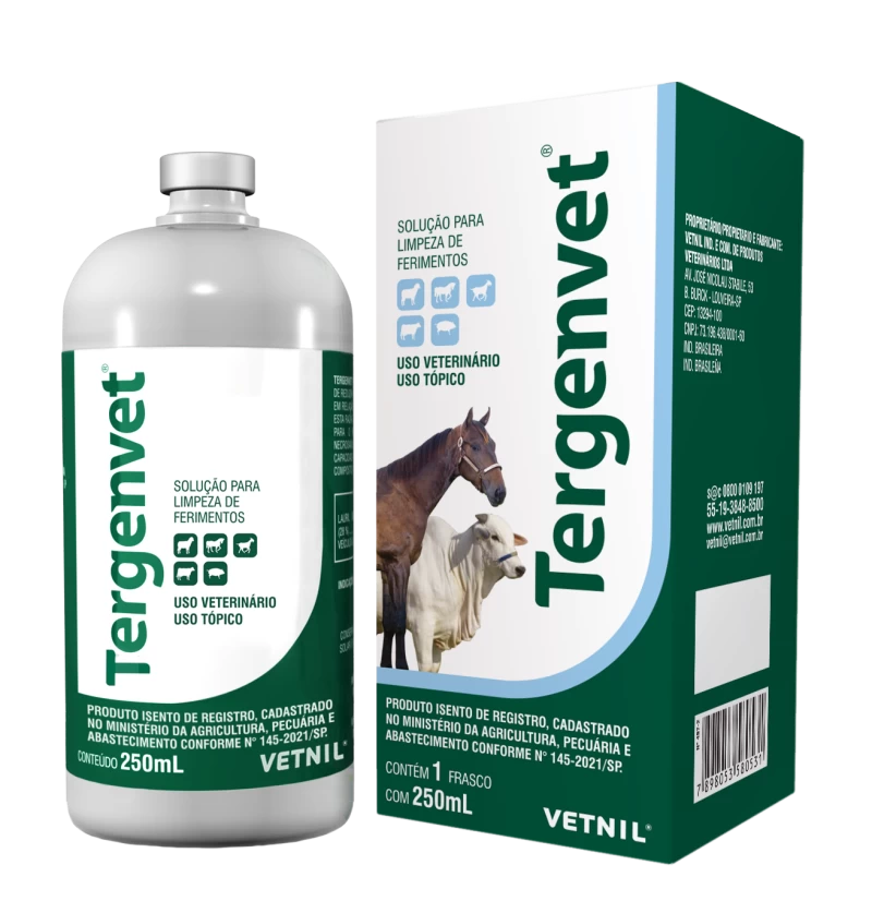 Tergenvet® é indicado para higiene e limpeza da pele integra e lesionada de equinos, bovinos, suínos, caprinos e ovinos.