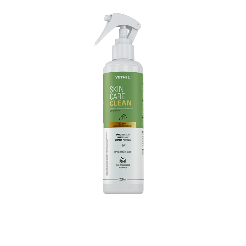 Vetnil® Skin Care Clean contém uma exclusiva combinação de elementos em sua fórmula que atuam de maneira sinérgica na promoção da higiene e limpeza da pele. A apresentação em spray facilita a aplicação no animal, mesmo em regiões do corpo de difícil acesso.