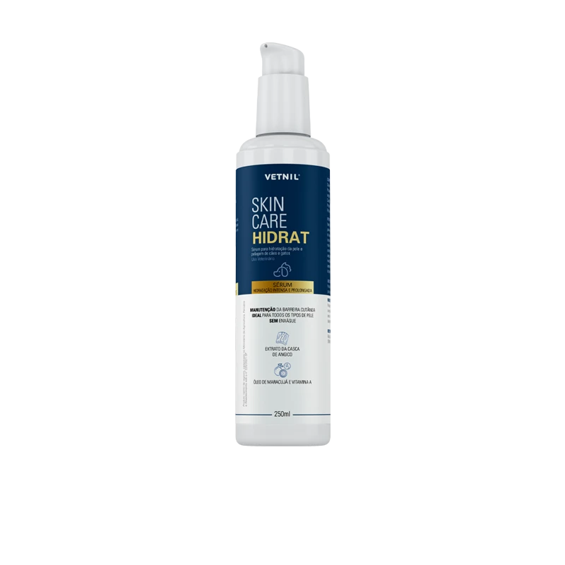 Vetnil® Skin Care Hidrat aumenta a hidratação da pele em nível celular. Sua formulação é capaz de estimular as proteínas que formam canais de água na pele (aquaporinas), fornecendo maior hidratação diretamente para as células. A combinação do extrato glicerinado da casca de angico, da vitamina A e do óleo de maracujá conferem revitalização, hidratação e maciez à pele. O produto apresenta-se como opção ideal para diferentes tipos de pele, inclusive oleosas e sensíveis.
